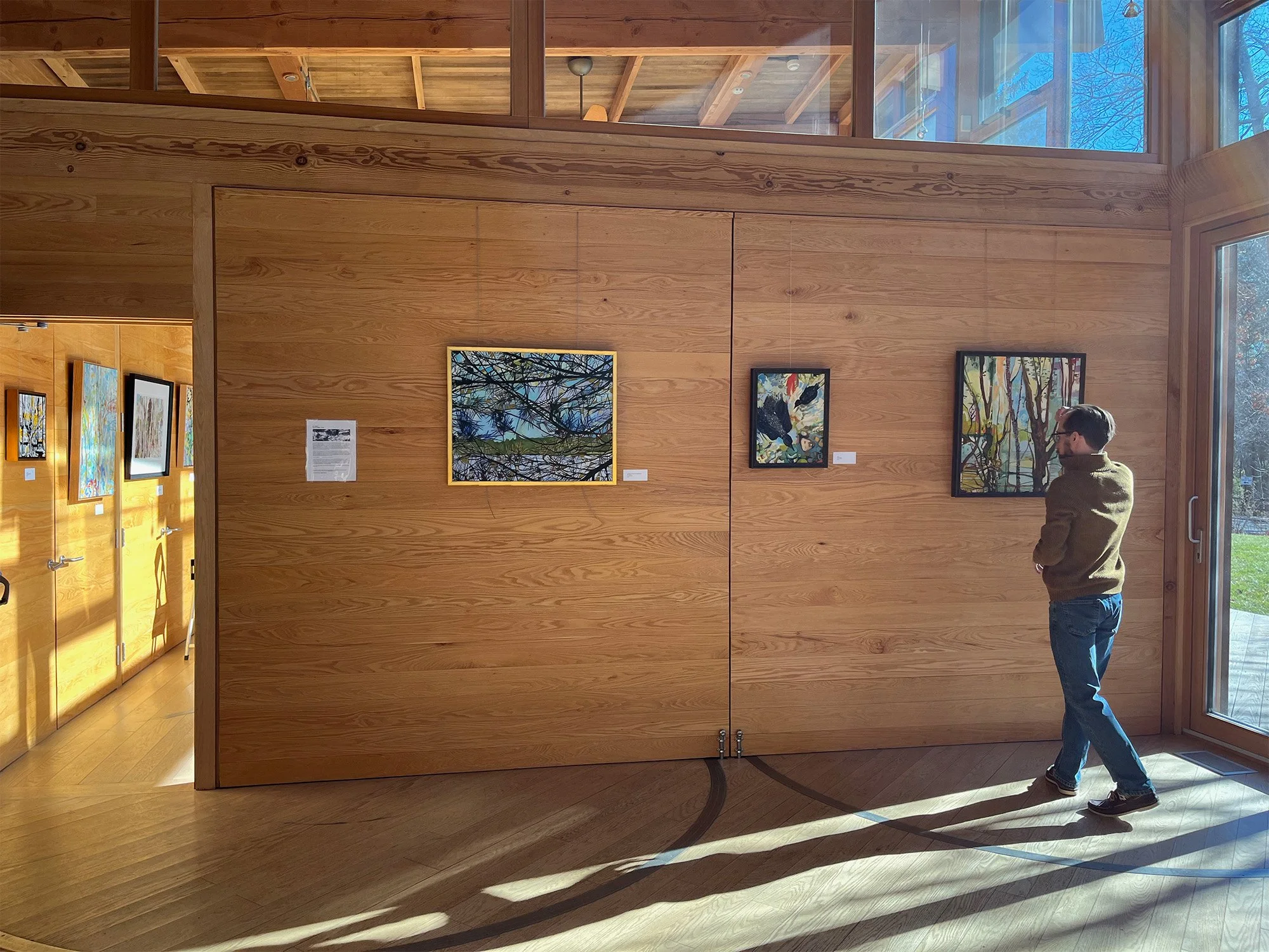 View looking through the glass into the Visitor's Center Gallery at the Walden Pond Center.